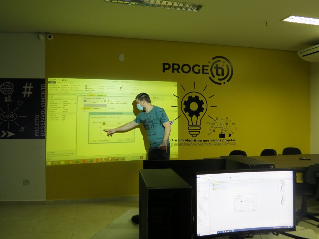Esta semana o ProgeTi (Programa Estratégico de Geração de Emprego em Tecnologia da Informação) ofereceu para alguns instrutores de informática da Secretaria de Educação, uma aula básica como teste do curso de Programação com Games. A capacitação é uma das opções do programa para as crianças de 7 a 12 anos.